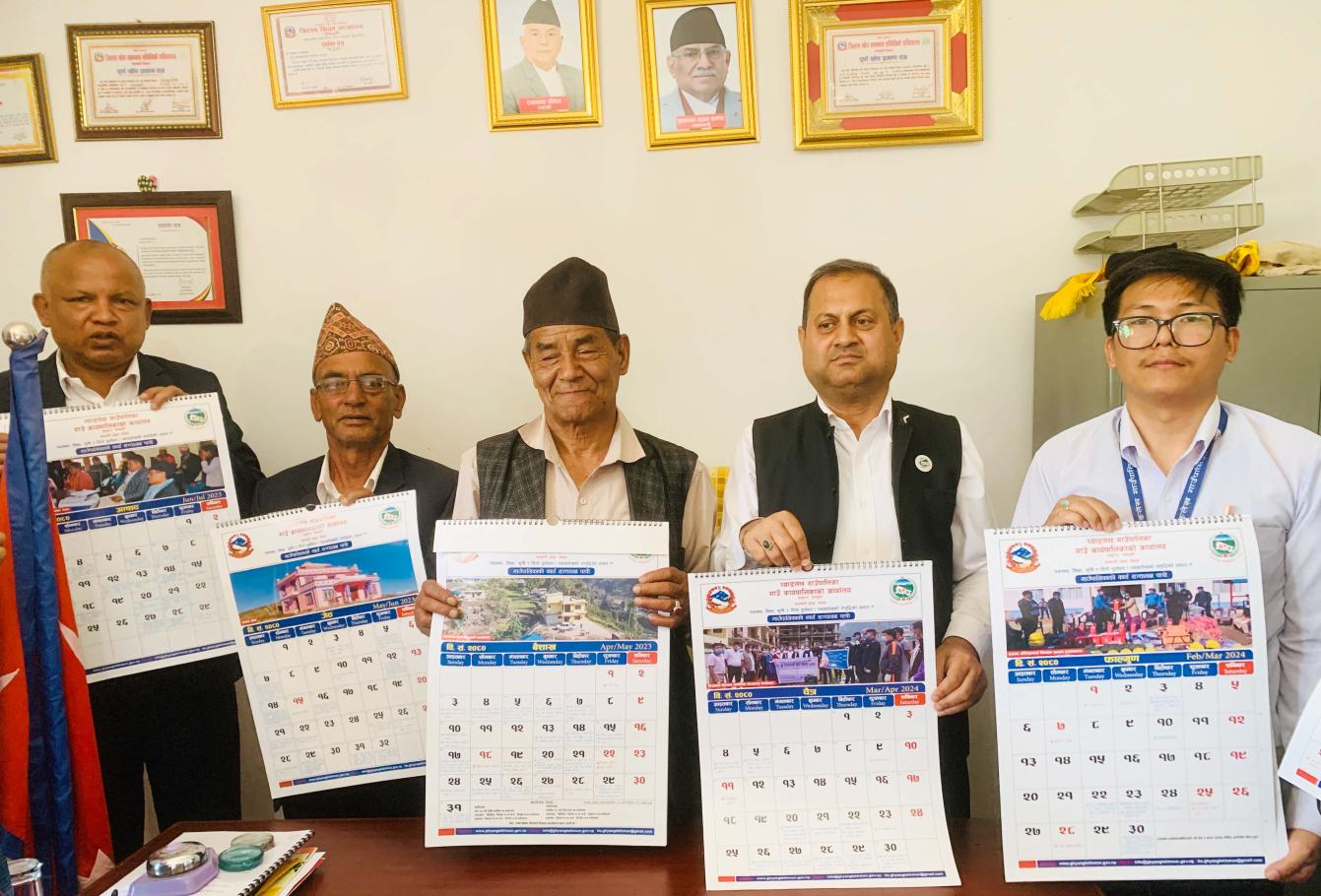 आज मिति २०७९ चैत्र २६ गतेका दिन घ्याङलेख गाउँपालिकाका अध्यक्ष श्री जगत बहादुर भोलनज्यू,प्रमुख प्रशासकीय अधिकृत श्री राम कुमार कार्की लगायत कर्मचारीहरुको उपस्थितिमा वि.स.२०८० सालको घ्याङलेख गाउँपालिकाको कार्य सञ्चालन पात्रो (क्यालेण्डर) बिमोचन/लोकार्पण कार्यक्रम सम्पन्न गरियो ।