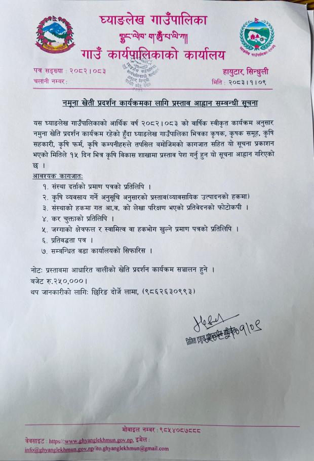 नमूना खेती प्रदर्शन कार्यक्रमका लागि प्रस्ताव आह्वान सम्बन्धी सूचना।