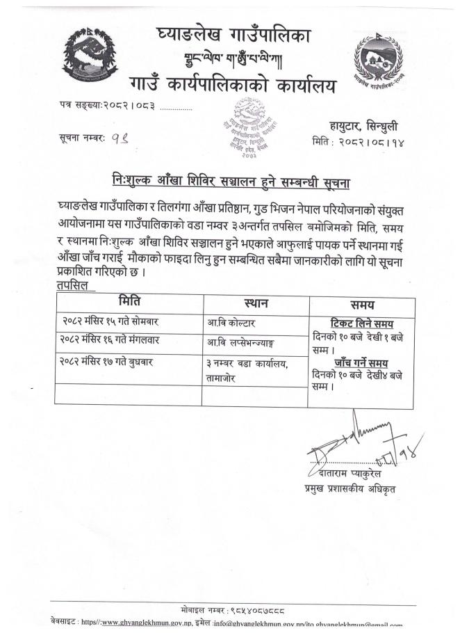 नि:शुल्क आँखा शिविर सञ्चालन हुने सम्बन्धी सूचना।