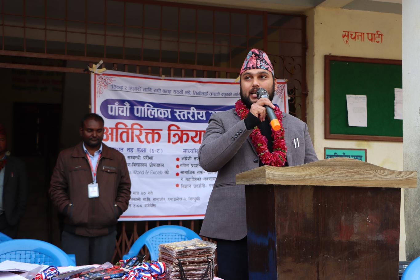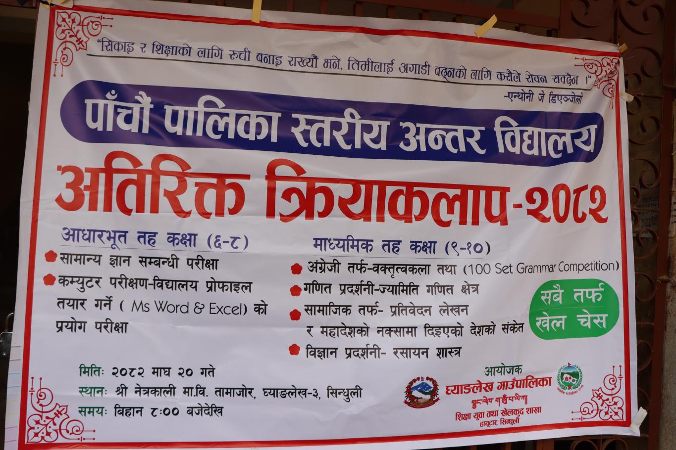 घ्याङलेख गाउँपालिकाको आयोजनामा "पाचौँ पालिका स्तरीय अन्तर विद्यालय अतिरिक्त क्रियाकलाप-२०८२", वरिष्ठ विद्यालय निरीक्षक श्री सुरेन्द्र कुमार स्याङतानको अध्यक्षतामा सम्पन्न भएको छ। कार्यक्रममा घ्याङलेख गाउँपालिकाका उपाध्यक्ष श्री शंकरमान घलान,प्रमुख प्रशासकीय अधिकृत श्री दाताराम प्याकुरेल,सहभागी विद्यालयका प्रधानाध्यापकहरु,शिक्षक, शिक्षिकाहरु,विषयगत शाखाका विज्ञहरु,विद्याथीहरु,विभिन्न शाखा /इकाइ/सेवा केन्द्र/वडा कार्यालयमा कार्यारत कर्मचारीहरु,स्थानिय वुद्धिजीवीहरु लगायतको उपस्थिति रहेको थियो । पालिका स्तरीय अन्तर विद्यालय अतिरिक्त क्रियाकलापमा श्री मा.वि. मरिण हायुटार प्रथम,श्री नेत्रकाली मा.वि.रामपुर द्वितीय र श्री नेत्रकाली मा.वि. तामाजोर तृतीय भएका छन्।