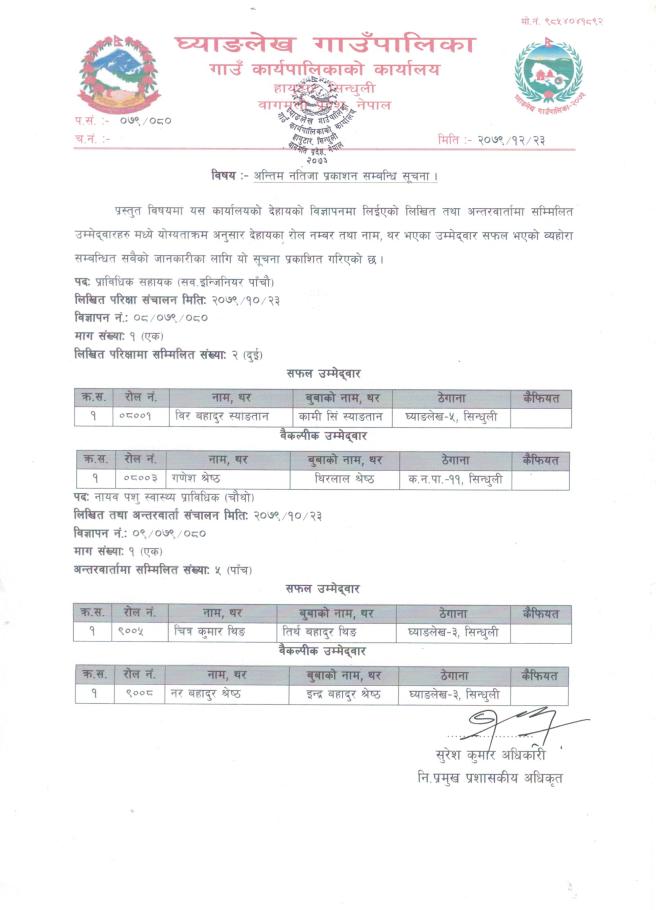 प्राविधिक सहायक पदको अन्तिम नतिजा प्रकाशन सम्बन्धमा