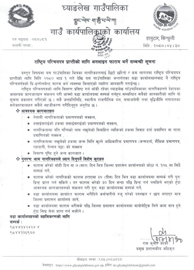 राष्ट्रिय परिचय-पत्र प्राप्तीको लागि अनलाइन फाराम भर्ने सम्बन्धी सूचना