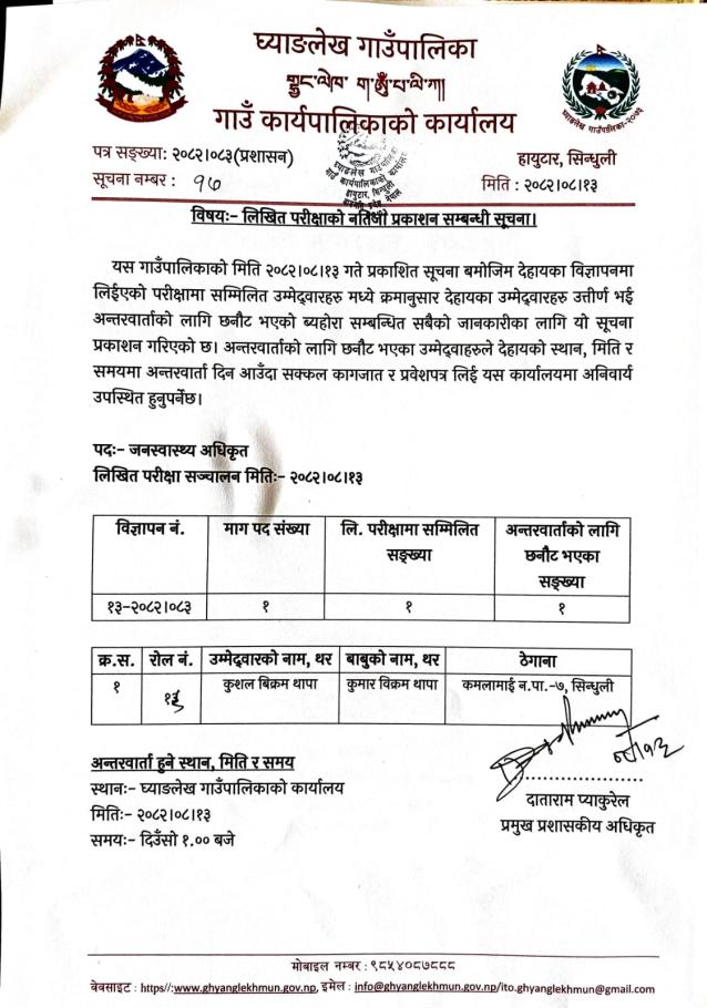 लिखित परीक्षाको नतिजा प्रकाशन सम्बन्धी सूचना ।