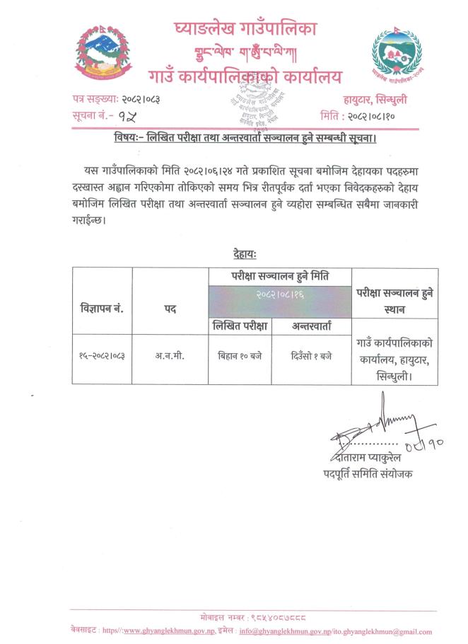 लिखित परीक्षा तथा अन्तरवार्ता सञ्चालन हुने सम्बन्धी सूचना ।
