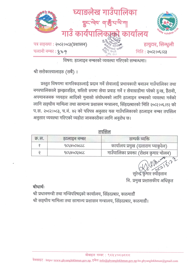 हटलाइन नम्बरको व्यवस्था गरिएको सम्बन्धमा ।