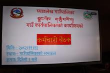 आज मिति २०८२।११।१२ गते मंगलबारका दिन यस घ्याङलेख गाउँपालिकामा कार्यरत कर्मचारीहरुको उपस्थितिमा कर्मचारी बैठक प्रमुख प्रशासकीय अधिकृत श्री दाताराम प्याकुरेल ज्यूको अध्यक्षतामा सम्पन्न भयो।