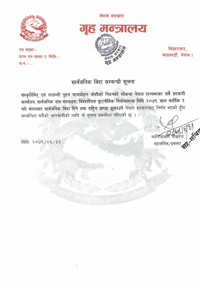 आज सार्वजनिक विदा सम्बन्धी गृह मन्त्रालयको सूचना