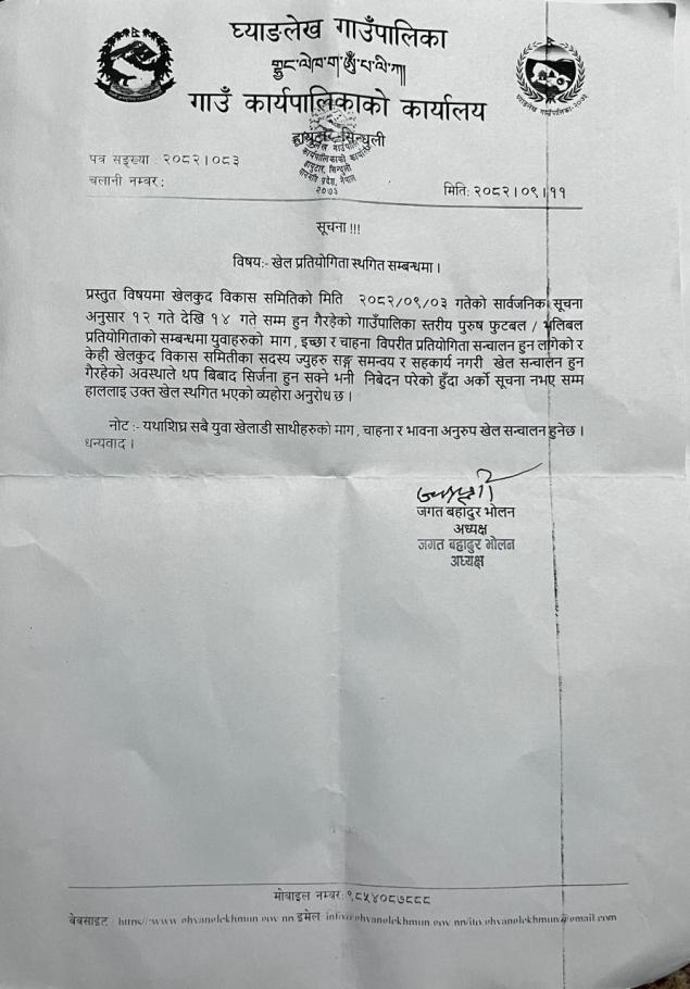 खेल प्रतियोगिता स्थगित सम्बन्धमा ।