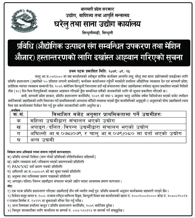 घरेलु तथा साना उद्योग कार्यालय, सिन्धुलीको सूचना