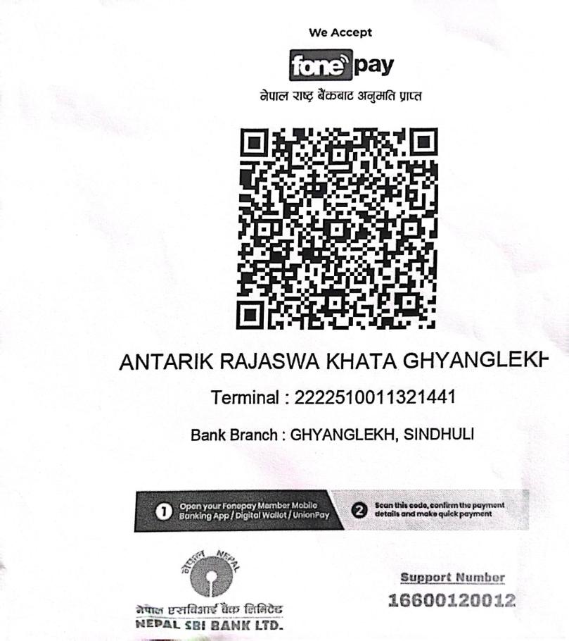 घ्याङलेख गाउँपालिकामा आज आन्तरिक राजस्व खाताको QR Code सार्वजनिक भएको छ । प्रमुख प्रशासकीय अधिकृत श्री राम कुमार कार्की, लेखा अधिकृत सातौं श्री सुरेश कुमार अधिकारी र नेपाल एसविआई बैंक, घ्याङलेख शाखाका प्रवन्धक श्री किशोरी शाहले संयुक्त रुपमा आज QR Code सार्वजनिक गर्नुभएको हो । अब देखि QR Code को माध्यमबाट राजस्वको शुल्क सहजै भूक्तानी गर्न सकिने छ ।
