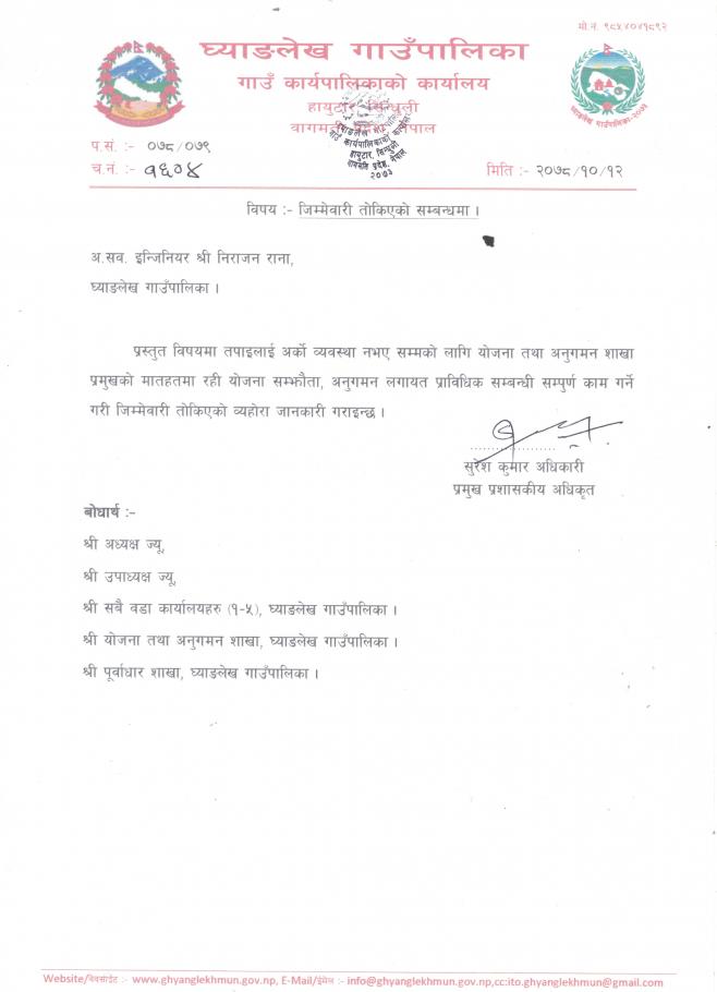 जिम्मेवारी तोकिएको सम्बन्धमा - श्री निराजन राना (अ. सव-इन्जिनियर)