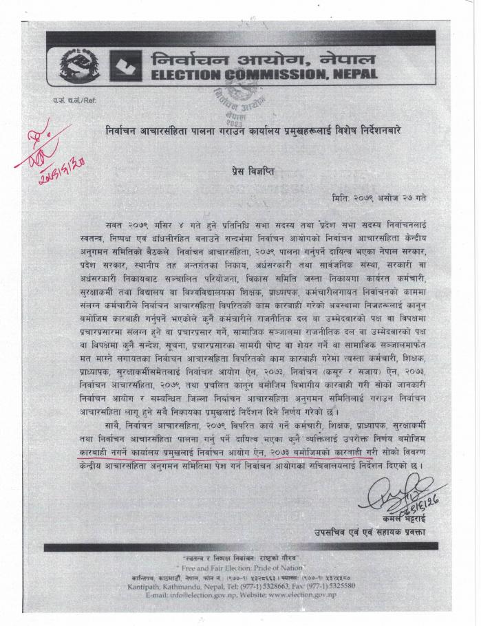 निर्वाचन आचारसंहिता पालना गराउन कार्यालय प्रमुखहरुलाई विशेष निर्देशन बारे निर्वाचन आयोग, नेपालको प्रेस विज्ञप्ति