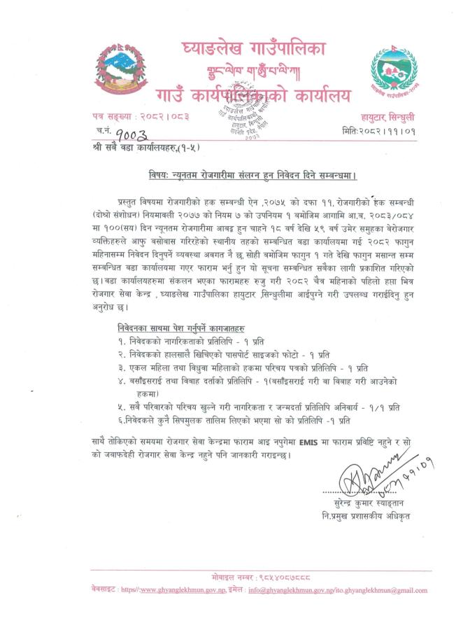 न्यूनतम रोजगारीमा संलग्न हुन निवेदन दिने सम्बन्धमा ।