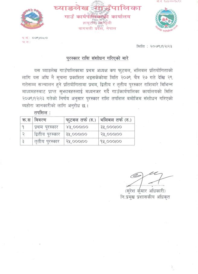 पुरस्कारको राशि संशोधन गरिएको सम्बन्धमा