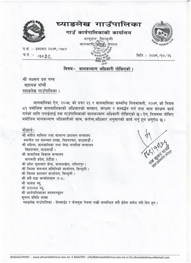 बाल कल्याण अधिकारी तोकिएको सम्बन्धमा