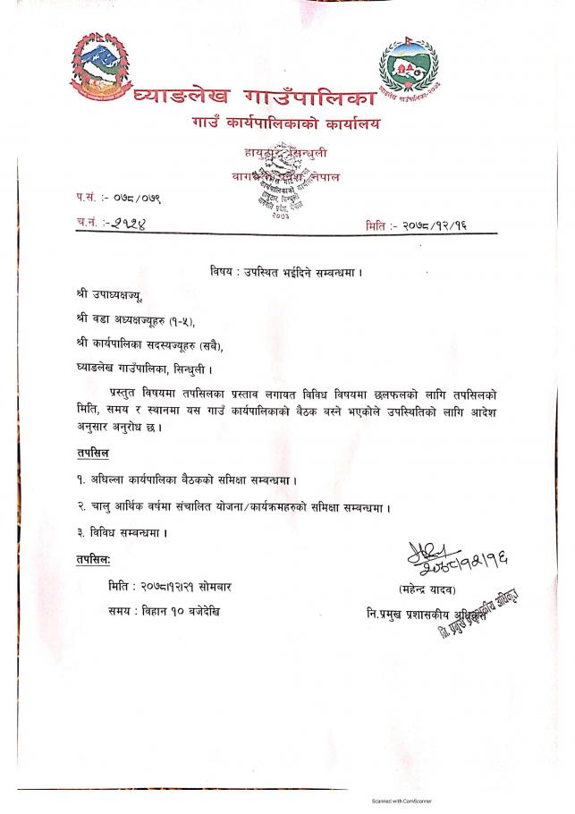 मिति २०७८।१२।२१ गतेको कार्यपालिकाको बैठकमा उपस्थित भईदिने सम्बन्धमा