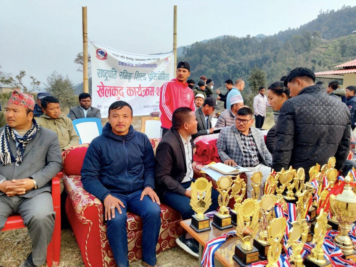 "राष्ट्रका लागी खेलकुद, स्वास्थ्यका लागि खेलकुद" भन्ने मूल नाराका साथ यहि माघ १२ गते देखि घ्याङलेख गाउँपालिकाको वडा नम्बर ३ स्थित कोल्टारमा सञ्चालन गरिएको राष्ट्रपति रनिङ्ग शिल्ड प्रतियोगिता, २०८० हिजो माघ १४ गते सफलतापूर्वक सम्पन्न गरियो । घ्याङलेख गाउँपालिकाको खेलकुद विकास समितिको अध्यक्ष अविनाश वाईबाको अध्यक्षता, घ्याङलेख गाउँपालिकाका उपाध्यक्ष शंकर मान घलानको प्रमुख आतिथ्यता, नि. प्रमुख प्रशासकीय अधिकृत सुरेन्द्र कुमार स्याङ्तानको विशिष्ट आतिथ्यता, वडा अध्यक्षहरु, प्रधानाध्यापकहरु, शिक्षक/शिक्षिकाहरु, स्वास्थ्यकर्मीहरु, सुरक्षाकर्मीहरु लगायत अन्य अतिथिहरु र खेलाडीहरुको समुपस्तिथिमा समापन कार्यक्रम भएको थियो । जम्मा १५ वटा विधाका प्रतिस्पर्धाहरु मध्ये छात्र/छात्रा सहित ८ वटा प्रतिस्पर्धाहरुमा स्वर्ण पदक जितेर श्री नेत्रकाली मा. वि. आँपडाँडा, रामपुरले प्रथम स्थान हाँसिल गर्न सफल भएकोमा श्री मा. वि. मरिण हायुटारले ३ स्वर्ण पदक सहित दोस्रो स्थानमा रहन सफल भयो । श्री मा. वि. नेत्रकाली तामाजोर भने २ स्वर्ण पदक सहित तेस्रो भए । घ्याङलेख गाउँपालिकामा रहेका ६ वटा माध्यमिक विद्यालयहरु सहभागी यस प्रतियोगिताका विजेता खेलाडीहरुले शिल्ड, मेडल र प्रमाणपत्र प्राप्त गरेका छन् । प्रत्येक विधामा प्रथम स्थान हाँसिल गर्ने टोलीले घ्याङलेख गाउँपालिकालाई प्रतिनिधित्व गर्दै सिन्धुलीको सदरमुकाम सिन्धुलीमाढीमा आजबाट सञ्चालन हुने जिल्लास्तरीय राष्ट्रपति रनिङ्ग शिल्ड प्रतियोगितामा भाग लिने छन् ।