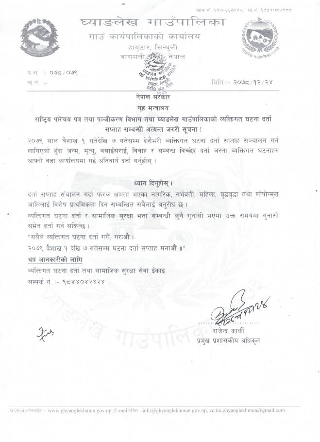 राष्ट्रिय परिचय-पत्र तथा पञ्जिकरण विभाग तथा घ्याङलेख गाउँपालिकाको व्यक्तिगत घटना दर्ता सप्ताह सम्बन्धी अत्यन्त जरुरी सूचना
