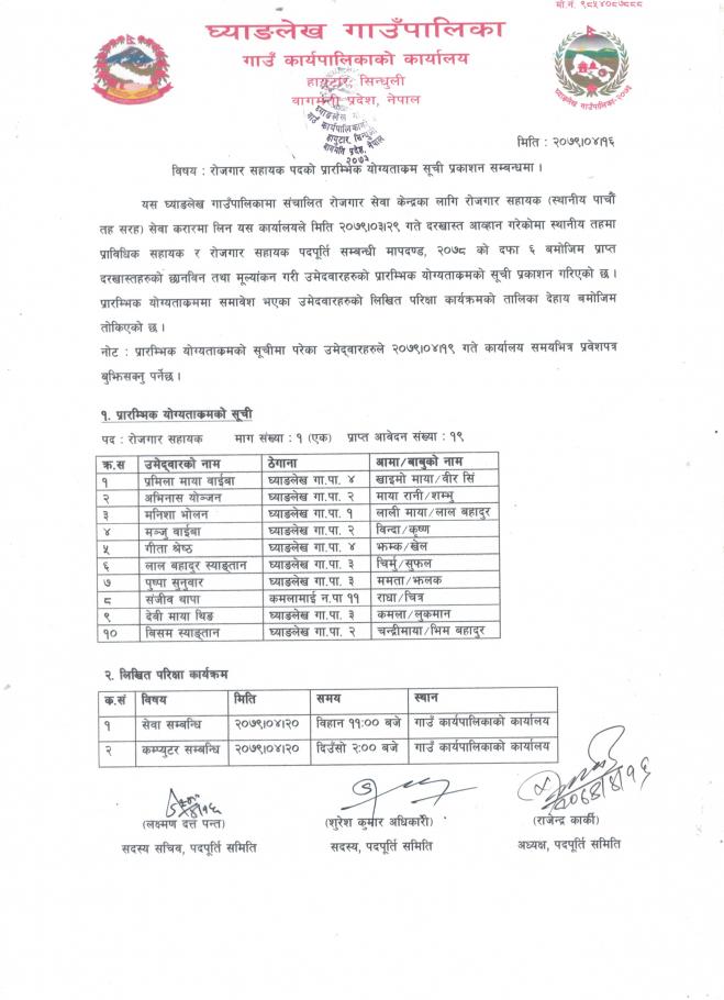 रोजगार सहायक पदको प्रारम्भिक योग्यताक्रम सूची प्रकाशन सम्बन्धमा