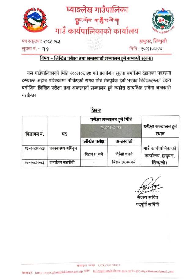 लिखित परीक्षा तथा अन्तरवार्ता सञ्चालन हुने सम्बन्धी सूचना ।