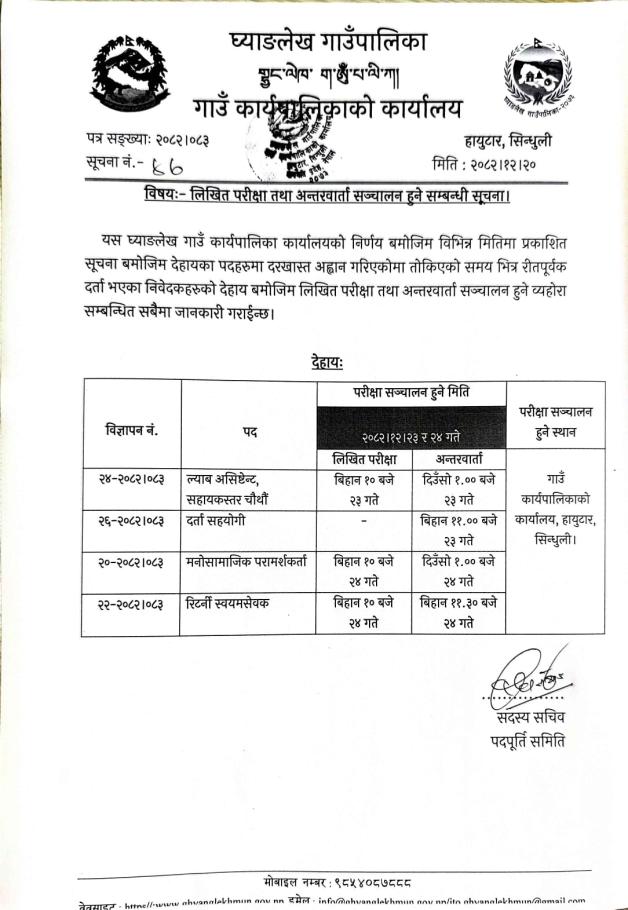 लिखित परीक्षा तथा अन्तरवार्ता सञ्चालन हुने सम्बन्धी सूचना ।