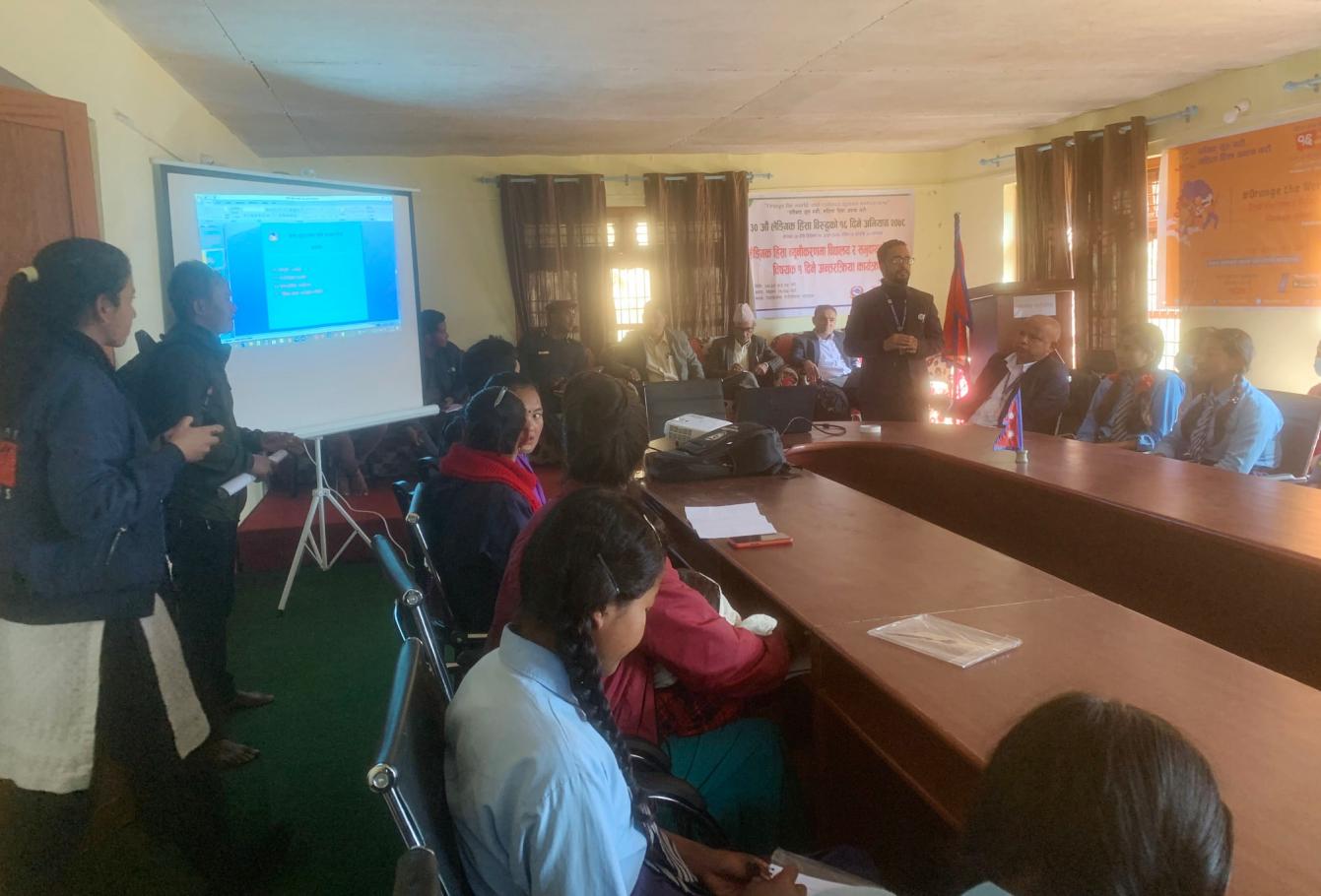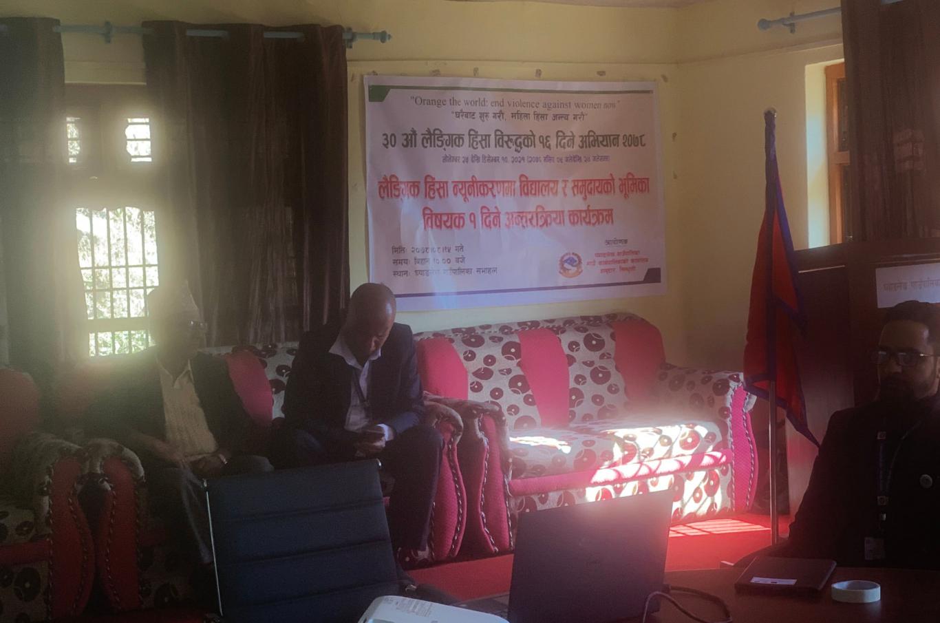 "घरैबाट शुरु गरौं, महिला हिंसा अन्त्य गरौं" भन्ने मूल नाराका साथ ३० औं लैंगिक हिंसा बिरुद्धको १६ दिने अभियान २०७८ अन्तर्गत लैंगिक हिंसा न्यूनीकरणमा विद्यालय र समुदायको भूमिका विषयक १ दिने अन्तरक्रिया घ्याङलेख गाउँपालिकामा आज सम्पन्न भएको छ । गाउँपालिकाका प्रवक्ता एबं वडा नं. २ का अध्यक्ष श्री एक बहादुर खड्काज्यूको अध्यक्षताम सम्पन्न कार्यक्रममा प्रमुख प्रशासकीय अधिकृत श्री राम कुमार कार्की, अन्य अतिथिज्यूहरु, कर्मचारीहरु र श्री मा. वि. मरिण हायूटारका कक्षा १० मा अध्ययनरत छात्राहरुको सहभागिता रहेको थियो । अधिकृत छैठौं गिरीराज खनाल र प्रशासन सहायक लक्ष्मण दत्त पन्त सरहरुले लैंगिक हिंसा सम्बन्धी प्रस्तुति राख्नुभएको यस कार्यक्रम महिला बालबालिका तथा जेष्ठ नागरिक शाखा प्रमुख देबु खड्काले सञ्चालन गर्नुभएको थियो । मिति २०७८ मंसिर ०९ गते देखि सुरु भएको यो अभियान विभिन्न कार्यक्रमहरु गरी मंसिर २४ गते समापन हुनेछ ।