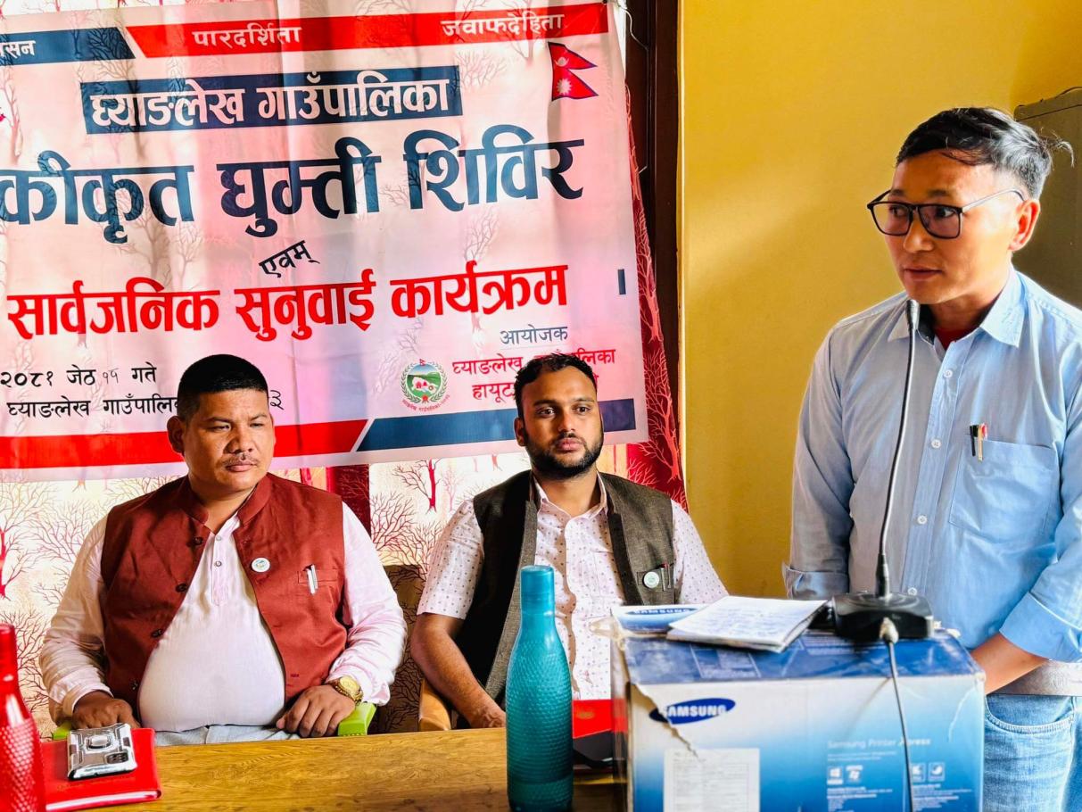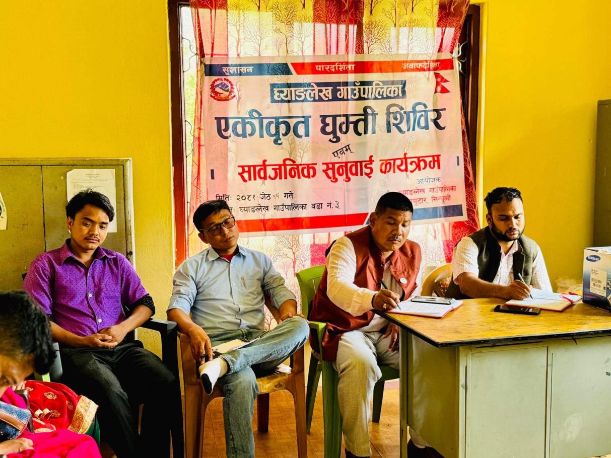 घ्याङलेख गाउँपालिकाले गर्ने वस्तु तथा सेवा प्रवाह र काम कारबाहीको गुणस्तरका बारेमा सार्वजनिक पदाधिकारीहरु (उपाध्यक्ष - शंकरमान घलान, प्रमुख प्रशासकीय अधिकृत - दाताराम प्याकुरेल, वडा नं. ३ का अध्यक्ष - निश्चल सुनुवार र सम्बन्धित शाखा प्रमुखहरु ) र सरोकारवालाहरुबीच प्रत्यक्ष अन्तरक्रिया कार्यक्रम गरी वडा नं. ३ को कार्यालय तामाजोरमा आज सार्वजनिक सुनुवाई सम्पन्न गरियो ।