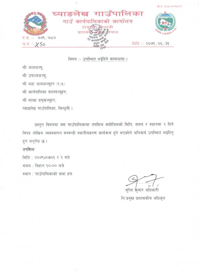 विपद् जोखिम व्यवस्थापन सम्बन्धी कार्यक्रममा उपस्थिति भईदिने सम्बन्धमा