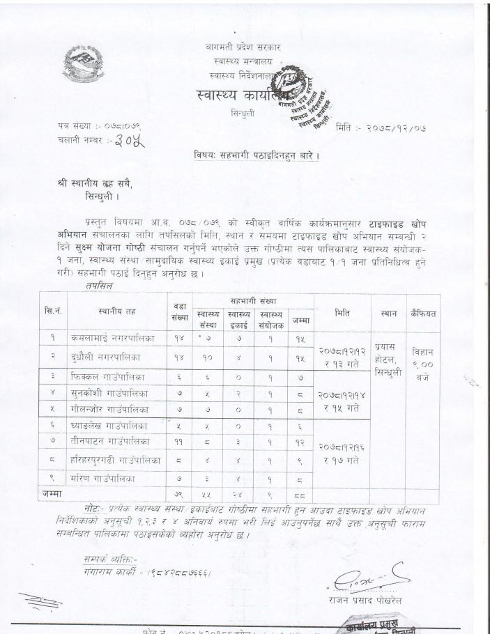२०७८ चैत्र १६ र १७ गते हुने २ दिने कार्यक्रमको लागि सहभागी पठाइदिने बारे स्वास्थ्य कार्यालय, सिन्धुलीको सूचना