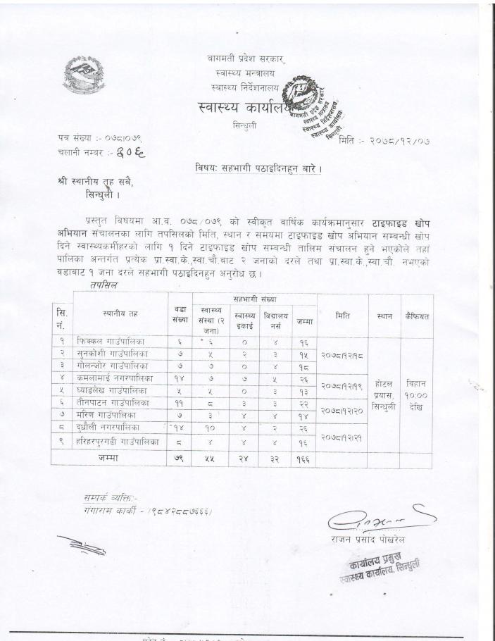 २०७८ चैत्र १९ गते हुने कार्यक्रमको लागि सहभागी पठाइदिने बारे स्वास्थ्य कार्यालय, सिन्धुलीको सूचना