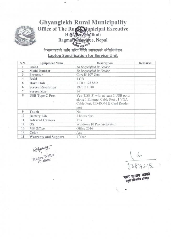 विद्यालयहरुको लागि खरिद गरिने ल्यापटपको स्पेसिफिकेसन
