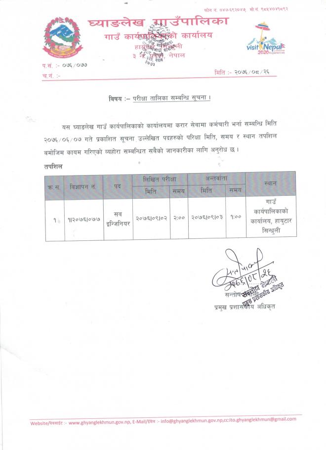 सव-ईन्जिनियर पदको परीक्षा तालिका सम्बन्धि सूचना